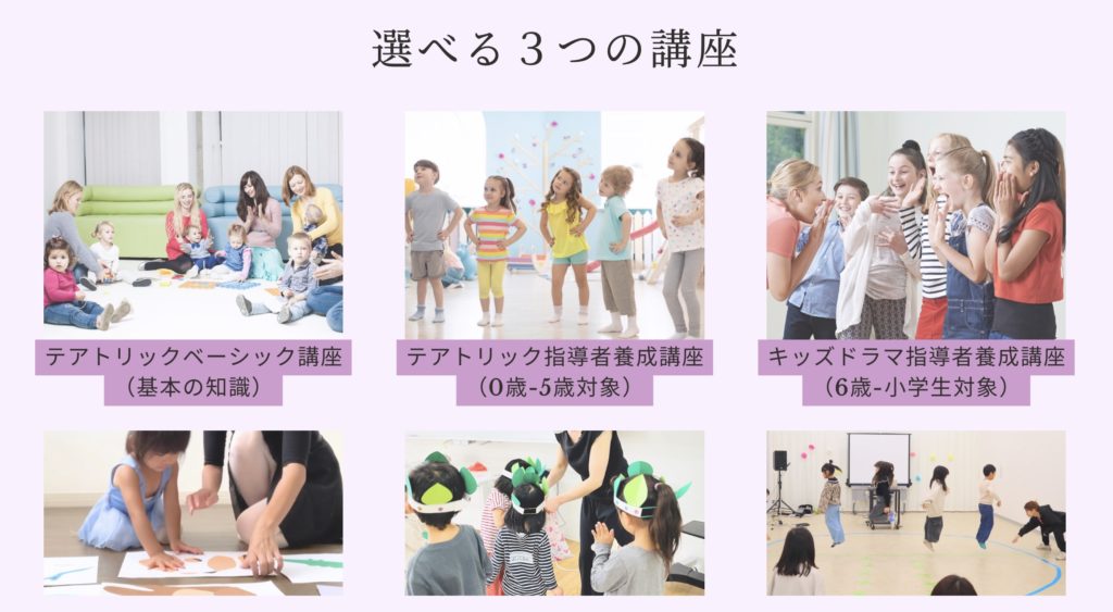 子どもたちや教育関係者の方々へお伝えしていくため、体験型演劇教育「プレイテアトリック」を全国で開催してきました。このプログラムはこれからの子どもたちに必要な学びと認められ、文部科学省土曜学習応援団の教育プログラムとして2024年9月に登録されました。そのプログラムの基礎の知識と指導法を学べる講座です。